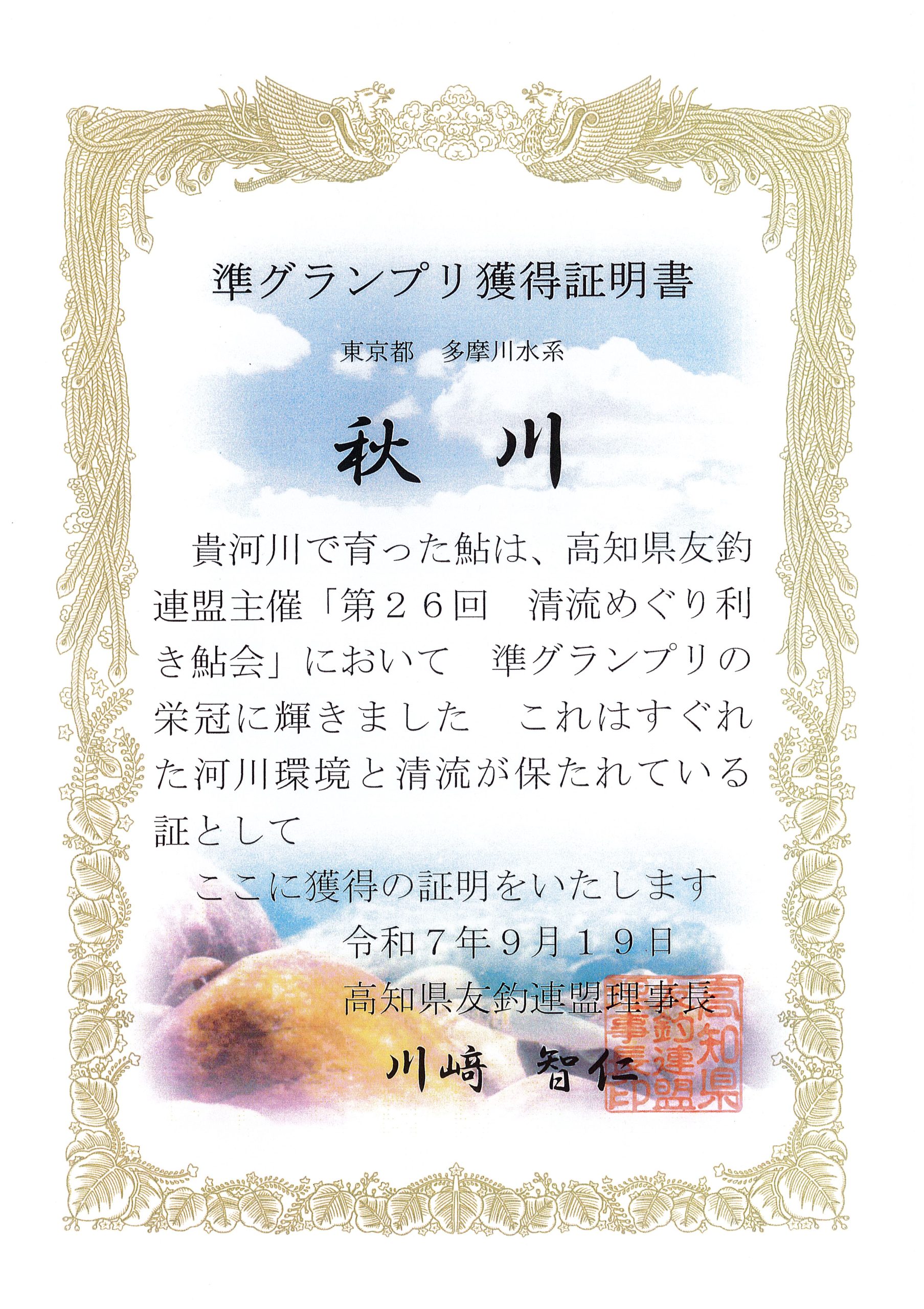 9月19日(金)に高知県で開催されました利き鮎会にて、秋川のアユが準グランプリーを受賞しました。