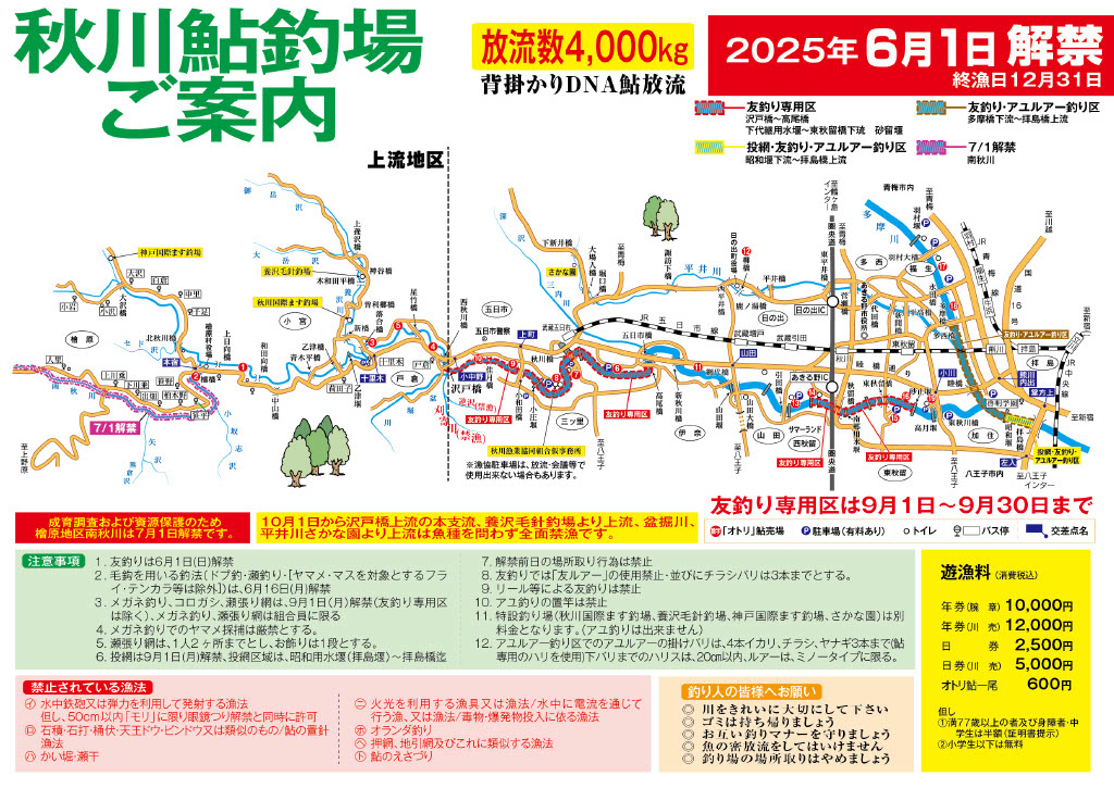 禁漁区間:秋川本支流は沢戸橋より上流・平井川は下新井橋より上流、盆堀川・深沢川となります。